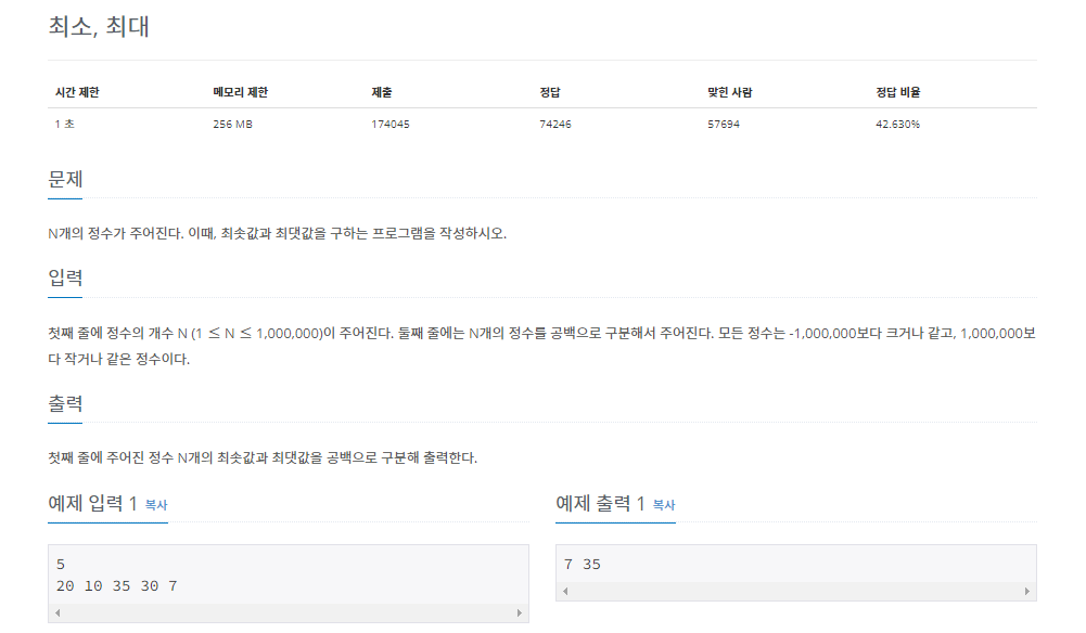 첫째 줄에 정수의 개수 N (1 ≤ N ≤ 1,000,000)이 주어진다. 둘째 줄에는 N개의 정수를 공백으로 구분해서 주어진다. 모든 정수는 -1,000,000보다 크거나 같고, 1,000,000보다 작거나 같은 정수이다.