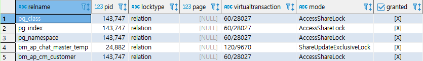 현재 테이블에 lock을 확인 할 수 있다. 기본적으로 대부분의 lock 테이블은 괜찮으나 RowExclusiveLock 이 검색된다면 해당 테이블에 접근이 지연되어 다른 쿼리에도 영향을 미칠 수 있으므로 반드시 잡고있는 트랜잭션이나 서버 상태 등을 점검하여 lock을 해제 해 주는 작업이 필요하다.