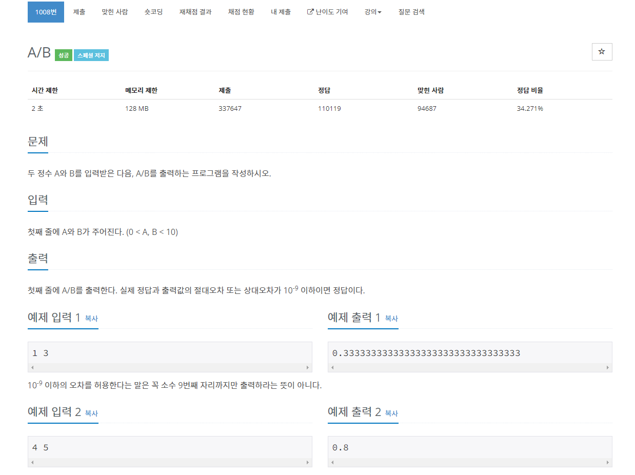 첫째 줄에 A/B를 출력한다. 실제 정답과 출력값의 절대오차 또는 상대오차가 10-9 이하이면 정답이다.