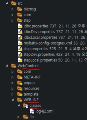- 기존의 log4j.xml 파일은 src 바로 하위 경로에 위치하고 있지만 log4j2.xml 파일은 WebContent/WEB-INF 하위에 classes 라는 디렉토리를 생성해서 그 안에 추가하면 된다.