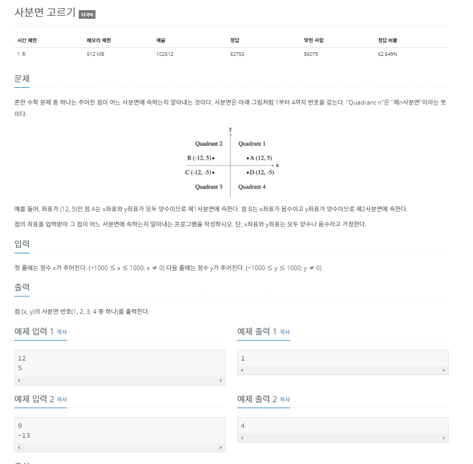 점의 좌표를 입력받아 그 점이 어느 사분면에 속하는지 알아내는 프로그램을 작성하시오. 단, x좌표와 y좌표는 모두 양수나 음수라고 가정한다.