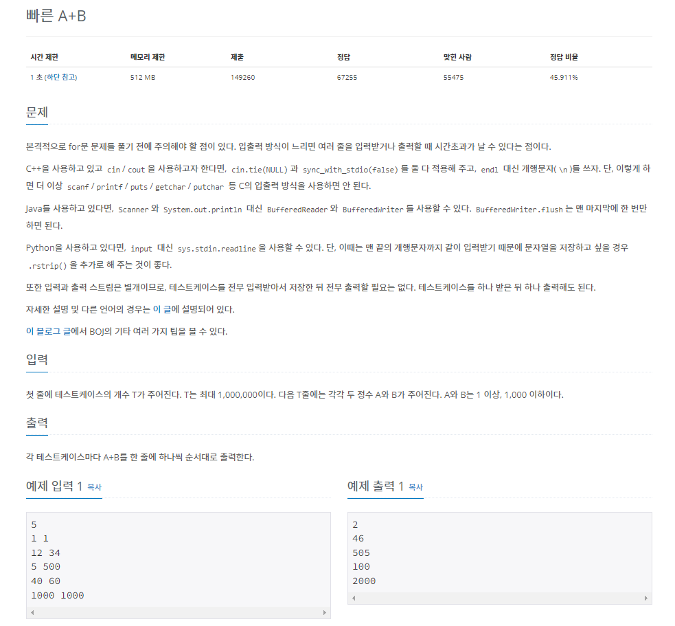 * 문제 본격적으로 for문 문제를 풀기 전에 주의해야 할 점이 있다. 입출력 방식이 느리면 여러 줄을 입력받거나 출력할 때 시간초과가 날 수