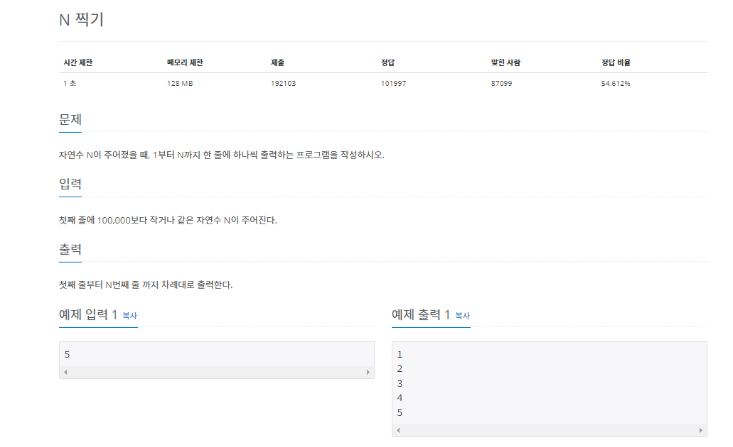 * 문제 자연수 N이 주어졌을 때, 1부터 N까지 한 줄에 하나씩 출력하는 프로그램을 작성하시오.