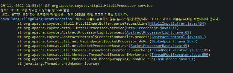 java.lang.IllegalArgumentException: 메소드 이름에 유효하지 않은 문자가 발견되었습니다. HTTP 메소드 이름은 유효한 토큰이어야 합니다. by 개발자 우디 개발/에러메세지 2022.02.11 에러메세지 원인 https 보안으로 인한 문제 해결 https 를 http 로 변경하면 된다. 공유하기 게시글 관리 우디의 개발스터디 저작자표시 비영리 (새창열림) 블로그의 정보 우디의 개발스터디 개발자 우디 활동하기 댓글 공유하기 다른 글 공유하기 카카오톡 카카오톡 LINE LINE Twitter Twitter Facebook Facebook 카카오스토리 카카오스토리 밴드 밴드 네이버 네이버 Pocket Pocket 다른 글 Cause: java.sql.SQLException: ORA-00911: 문자가 부적합합니다 Cause: java.sql.SQLException: ORA-00911: 문자가 부적합합니다 2022.02.25 Cause: java.sql.SQLException: ORA-01722: 수치가 부적합합니다 Cause: java.sql.SQLException: ORA-01722: 수치가 부적합합니다 2022.02.24 java.lang.Integer cannot be cast to java.lang.String java.lang.Integer cannot be cast to java.lang.String 2022.01.26 Cause: org.postgresql.util.PSQLException: ERROR: syntax error at or near "," Cause: org.postgresql.util.PSQLException: ERROR: syntax error at or near "," 2022.01.21 다른 글 더 보기