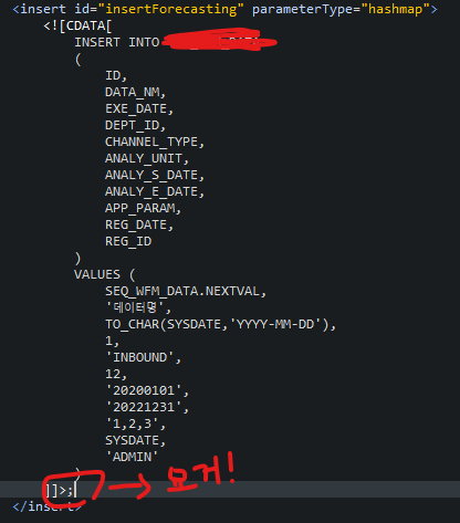 DB 툴에서는 ' ; ' 를 작성하는게 맞지만 자바 프로젝트의 xml 파일 내에서는 세미콜론 ' ; ' 을 붙이면 에러가 발생한다.