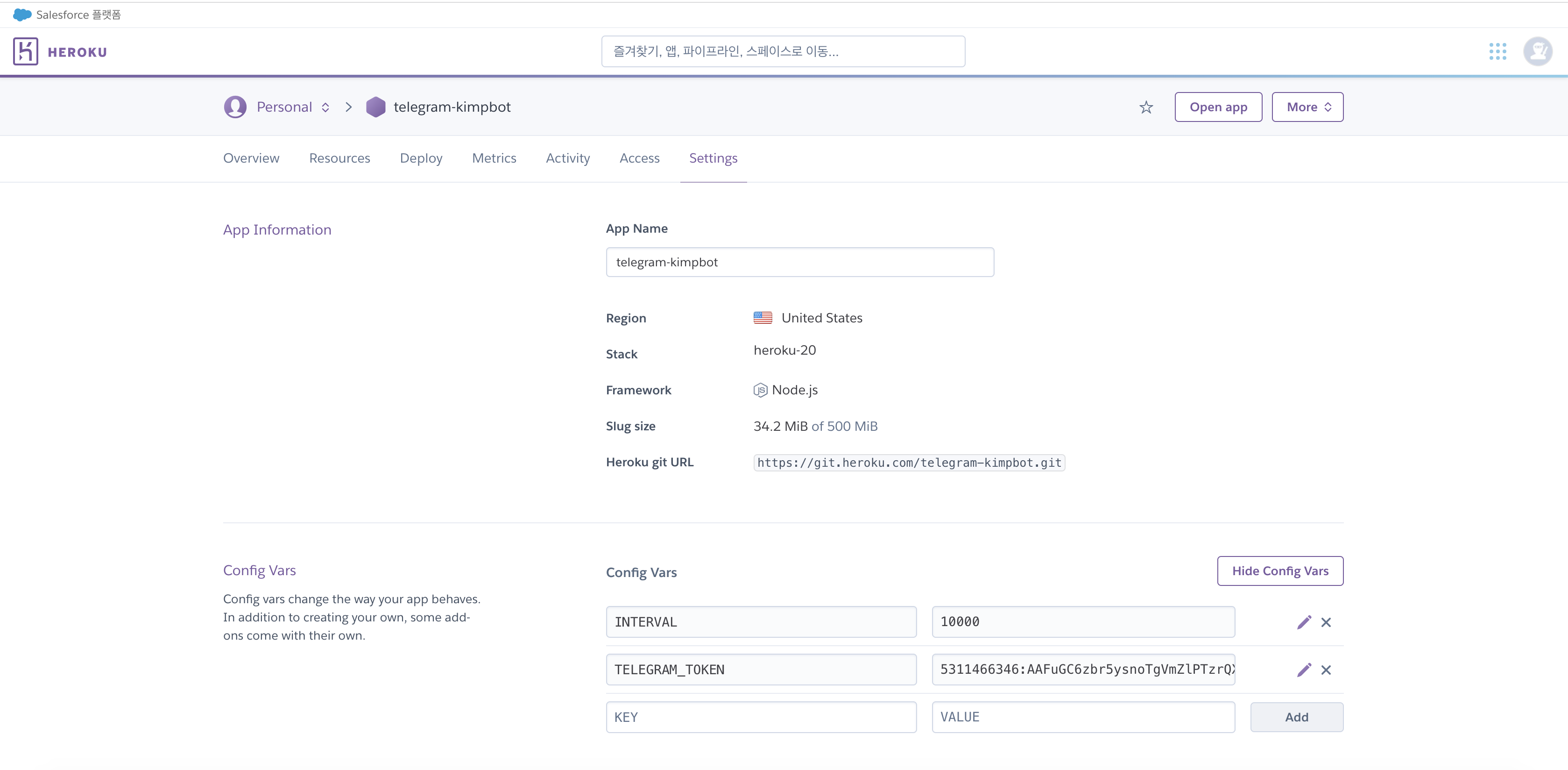 해당 Settings 메뉴에서 Config Vars 에 텔레그램에서 발급받은 키를 입력했다.(중요!)